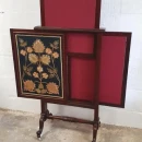 This is a truly distinctive antique mahogany firescreen, offering both aesthetic appeal and practical functionality for a traditional hearth. Crafted from rich mahogany, known for its beautiful reddish-brown tones and fine grain, the firescreen would have a luxurious and enduring quality. Its most remarkable feature is its adjustable screen, allowing the user to position it effectively to shield |
